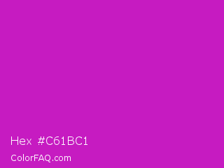 Hex #c61bc1 Color is a normal magenta color and the nearest color is Steel Pink #cc33cc. Hex code #c61bc1 and RGB value is rgb(198,27,193). In RGB color space, this color is composed of 78% red, 11% green, 76% blue, In CMYK color space, this color is composed of 0% cyan, 86% magenta, 3% yellow , 22% black , In HSL color space, this color has a hue angle of 302° , 76% saturation and 44% lightness.