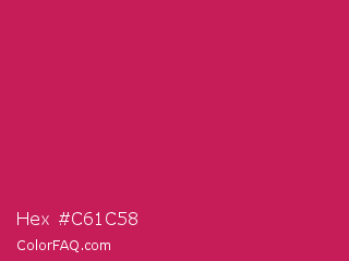 Hex #c61c58 Color is a normal rose color and the nearest color is Rose Red #c21e56. Hex code #c61c58 and RGB value is rgb(198,28,88). In RGB color space, this color is composed of 78% red, 11% green, 35% blue, In CMYK color space, this color is composed of 0% cyan, 86% magenta, 56% yellow , 22% black , In HSL color space, this color has a hue angle of 339° , 75% saturation and 44% lightness.