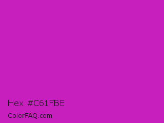 Hex #c61fbe Color is a normal magenta color and the nearest color is Steel Pink #cc33cc. Hex code #c61fbe and RGB value is rgb(198,31,190). In RGB color space, this color is composed of 78% red, 12% green, 75% blue, In CMYK color space, this color is composed of 0% cyan, 84% magenta, 4% yellow , 22% black , In HSL color space, this color has a hue angle of 303° , 73% saturation and 45% lightness.
