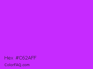 Hex #c62aff Color is a normal purple color and the nearest color is Veronica #a020f0. Hex code #c62aff and RGB value is rgb(198,42,255). In RGB color space, this color is composed of 78% red, 16% green, 100% blue, In CMYK color space, this color is composed of 22% cyan, 84% magenta, 0% yellow , 0% black , In HSL color space, this color has a hue angle of 284° , 100% saturation and 58% lightness.