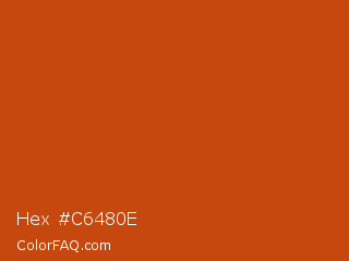 Hex #c6480e Color is a normal orange color and the nearest color is Tia Maria #c1440e. Hex code #c6480e and RGB value is rgb(198,72,14). In RGB color space, this color is composed of 78% red, 28% green, 5% blue, In CMYK color space, this color is composed of 0% cyan, 64% magenta, 93% yellow , 22% black , In HSL color space, this color has a hue angle of 19° , 87% saturation and 42% lightness.