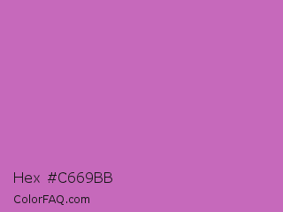 Hex #c669bb Color is a normal magenta color and the nearest color is Sky Magenta #cf71af. Hex code #c669bb and RGB value is rgb(198,105,187). In RGB color space, this color is composed of 78% red, 41% green, 73% blue, In CMYK color space, this color is composed of 0% cyan, 47% magenta, 6% yellow , 22% black , In HSL color space, this color has a hue angle of 307° , 45% saturation and 59% lightness.