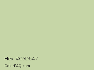 Hex #c6d6a7 Color is a light green color and the nearest color is Sprout #c1d7b0. Hex code #c6d6a7 and RGB value is rgb(198,214,167). In RGB color space, this color is composed of 78% red, 84% green, 65% blue, In CMYK color space, this color is composed of 7% cyan, 0% magenta, 22% yellow , 16% black , In HSL color space, this color has a hue angle of 80° , 36% saturation and 75% lightness.