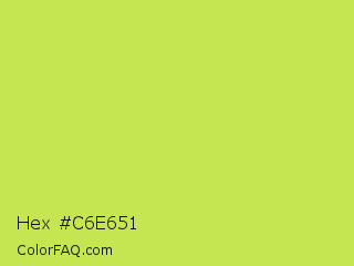 Hex #c6e651 Color is a light lime color and the nearest color is June Bud #bdda57. Hex code #c6e651 and RGB value is rgb(198,230,81). In RGB color space, this color is composed of 78% red, 90% green, 32% blue, In CMYK color space, this color is composed of 14% cyan, 0% magenta, 65% yellow , 10% black , In HSL color space, this color has a hue angle of 73° , 75% saturation and 61% lightness.
