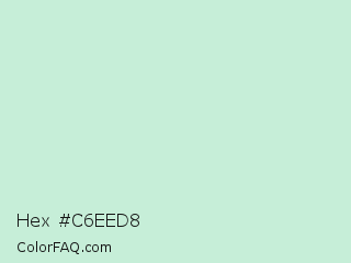 Hex #c6eed8 Color is a very light green color and the nearest color is Skeptic #cae6da. Hex code #c6eed8 and RGB value is rgb(198,238,216). In RGB color space, this color is composed of 78% red, 93% green, 85% blue, In CMYK color space, this color is composed of 17% cyan, 0% magenta, 9% yellow , 7% black , In HSL color space, this color has a hue angle of 147° , 54% saturation and 85% lightness.