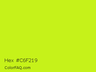 Hex #c6f219 Color is a normal lime color and the nearest color is Las Palmas #c6e610. Hex code #c6f219 and RGB value is rgb(198,242,25). In RGB color space, this color is composed of 78% red, 95% green, 10% blue, In CMYK color space, this color is composed of 18% cyan, 0% magenta, 90% yellow , 5% black , In HSL color space, this color has a hue angle of 72° , 89% saturation and 52% lightness.