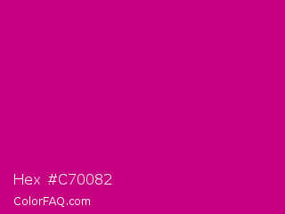 Hex #c70082 Color is a normal magenta color and the nearest color is Red Violet #c71585. Hex code #c70082 and RGB value is rgb(199,0,130). In RGB color space, this color is composed of 78% red, 0% green, 51% blue, In CMYK color space, this color is composed of 0% cyan, 100% magenta, 35% yellow , 22% black , In HSL color space, this color has a hue angle of 321° , 100% saturation and 39% lightness.