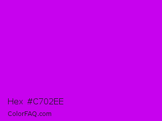 Hex #c702ee Color is a normal purple color and the nearest color is Vivid Orchid #cc00ff. Hex code #c702ee and RGB value is rgb(199,2,238). In RGB color space, this color is composed of 78% red, 1% green, 93% blue, In CMYK color space, this color is composed of 16% cyan, 99% magenta, 0% yellow , 7% black , In HSL color space, this color has a hue angle of 290° , 98% saturation and 47% lightness.