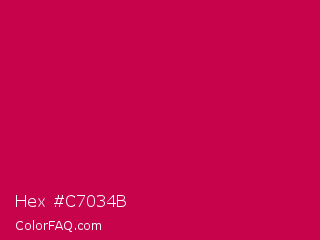 Hex #c7034b Color is a normal rose color and the nearest color is Pictorial Carmine #c30b4e. Hex code #c7034b and RGB value is rgb(199,3,75). In RGB color space, this color is composed of 78% red, 1% green, 29% blue, In CMYK color space, this color is composed of 0% cyan, 98% magenta, 62% yellow , 22% black , In HSL color space, this color has a hue angle of 338° , 97% saturation and 40% lightness.