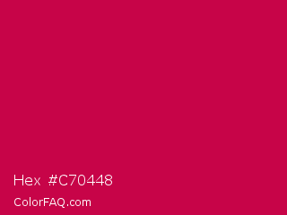 Hex #c70448 Color is a normal rose color and the nearest color is Pictorial Carmine #c30b4e. Hex code #c70448 and RGB value is rgb(199,4,72). In RGB color space, this color is composed of 78% red, 2% green, 28% blue, In CMYK color space, this color is composed of 0% cyan, 98% magenta, 64% yellow , 22% black , In HSL color space, this color has a hue angle of 339° , 96% saturation and 40% lightness.