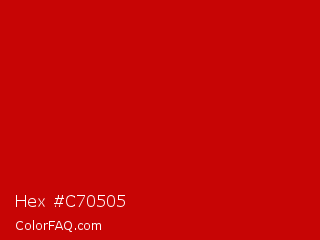 Hex #c70505 Color is a normal red color and the nearest color is Boston University Red #cc0000. Hex code #c70505 and RGB value is rgb(199,5,5). In RGB color space, this color is composed of 78% red, 2% green, 2% blue, In CMYK color space, this color is composed of 0% cyan, 97% magenta, 97% yellow , 22% black , In HSL color space, this color has a hue angle of 0° , 95% saturation and 40% lightness.