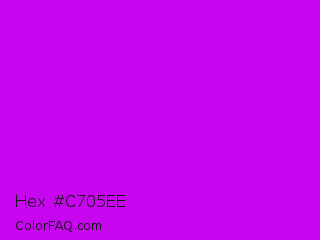 Hex #c705ee Color is a normal purple color and the nearest color is Vivid Orchid #cc00ff. Hex code #c705ee and RGB value is rgb(199,5,238). In RGB color space, this color is composed of 78% red, 2% green, 93% blue, In CMYK color space, this color is composed of 16% cyan, 98% magenta, 0% yellow , 7% black , In HSL color space, this color has a hue angle of 290° , 96% saturation and 48% lightness.
