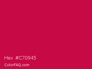 Hex #c70945 Color is a normal rose color and the nearest color is Pictorial Carmine #c30b4e. Hex code #c70945 and RGB value is rgb(199,9,69). In RGB color space, this color is composed of 78% red, 4% green, 27% blue, In CMYK color space, this color is composed of 0% cyan, 95% magenta, 65% yellow , 22% black , In HSL color space, this color has a hue angle of 341° , 91% saturation and 41% lightness.
