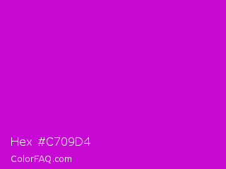 Hex #c709d4 Color is a normal magenta color and the nearest color is Deep Magenta #cc00cc. Hex code #c709d4 and RGB value is rgb(199,9,212). In RGB color space, this color is composed of 78% red, 4% green, 83% blue, In CMYK color space, this color is composed of 6% cyan, 96% magenta, 0% yellow , 17% black , In HSL color space, this color has a hue angle of 296° , 92% saturation and 43% lightness.