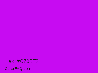 Hex #c70bf2 Color is a normal purple color and the nearest color is Vivid Orchid #cc00ff. Hex code #c70bf2 and RGB value is rgb(199,11,242). In RGB color space, this color is composed of 78% red, 4% green, 95% blue, In CMYK color space, this color is composed of 18% cyan, 95% magenta, 0% yellow , 5% black , In HSL color space, this color has a hue angle of 289° , 91% saturation and 50% lightness.