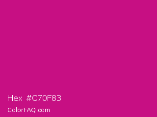 Hex #c70f83 Color is a normal magenta color and the nearest color is Red Violet #c71585. Hex code #c70f83 and RGB value is rgb(199,15,131). In RGB color space, this color is composed of 78% red, 6% green, 51% blue, In CMYK color space, this color is composed of 0% cyan, 92% magenta, 34% yellow , 22% black , In HSL color space, this color has a hue angle of 322° , 86% saturation and 42% lightness.