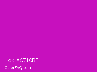 Hex #c710be Color is a normal magenta color and the nearest color is Deep Magenta #cc00cc. Hex code #c710be and RGB value is rgb(199,16,190). In RGB color space, this color is composed of 78% red, 6% green, 75% blue, In CMYK color space, this color is composed of 0% cyan, 92% magenta, 5% yellow , 22% black , In HSL color space, this color has a hue angle of 303° , 85% saturation and 42% lightness.