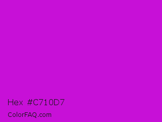 Hex #c710d7 Color is a normal magenta color and the nearest color is Vivid Mulberry #b80ce3. Hex code #c710d7 and RGB value is rgb(199,16,215). In RGB color space, this color is composed of 78% red, 6% green, 84% blue, In CMYK color space, this color is composed of 7% cyan, 93% magenta, 0% yellow , 16% black , In HSL color space, this color has a hue angle of 295° , 86% saturation and 45% lightness.