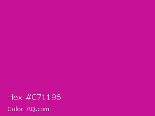 Hex #c71196 Color is a normal magenta color and the nearest color is Red Violet #c71585. Hex code #c71196 and RGB value is rgb(199,17,150). In RGB color space, this color is composed of 78% red, 7% green, 59% blue, In CMYK color space, this color is composed of 0% cyan, 91% magenta, 25% yellow , 22% black , In HSL color space, this color has a hue angle of 316° , 84% saturation and 42% lightness.