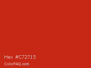 Hex #c72715 Color is a normal red color and the nearest color is Thunderbird #c02b18. Hex code #c72715 and RGB value is rgb(199,39,21). In RGB color space, this color is composed of 78% red, 15% green, 8% blue, In CMYK color space, this color is composed of 0% cyan, 80% magenta, 89% yellow , 22% black , In HSL color space, this color has a hue angle of 6° , 81% saturation and 43% lightness.
