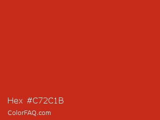 Hex #c72c1b Color is a normal red color and the nearest color is Thunderbird #c02b18. Hex code #c72c1b and RGB value is rgb(199,44,27). In RGB color space, this color is composed of 78% red, 17% green, 11% blue, In CMYK color space, this color is composed of 0% cyan, 78% magenta, 86% yellow , 22% black , In HSL color space, this color has a hue angle of 6° , 76% saturation and 44% lightness.