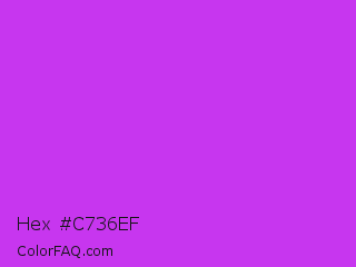 Hex #c736ef Color is a normal purple color and the nearest color is Steel Pink #cc33cc. Hex code #c736ef and RGB value is rgb(199,54,239). In RGB color space, this color is composed of 78% red, 21% green, 94% blue, In CMYK color space, this color is composed of 17% cyan, 77% magenta, 0% yellow , 6% black , In HSL color space, this color has a hue angle of 287° , 85% saturation and 57% lightness.