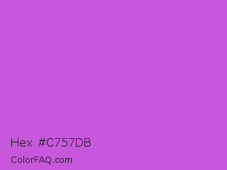 Hex #c757db Color is a normal purple color and the nearest color is Medium Orchid #ba55d3. Hex code #c757db and RGB value is rgb(199,87,219). In RGB color space, this color is composed of 78% red, 34% green, 86% blue, In CMYK color space, this color is composed of 9% cyan, 60% magenta, 0% yellow , 14% black , In HSL color space, this color has a hue angle of 291° , 65% saturation and 60% lightness.