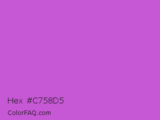 Hex #c758d5 Color is a normal magenta color and the nearest color is Medium Orchid #ba55d3. Hex code #c758d5 and RGB value is rgb(199,88,213). In RGB color space, this color is composed of 78% red, 35% green, 84% blue, In CMYK color space, this color is composed of 7% cyan, 59% magenta, 0% yellow , 16% black , In HSL color space, this color has a hue angle of 293° , 60% saturation and 59% lightness.