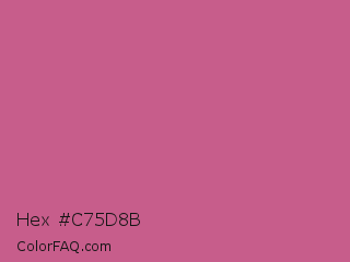 Hex #c75d8b Color is a normal rose color and the nearest color is Cinnamon Satin #cd607e. Hex code #c75d8b and RGB value is rgb(199,93,139). In RGB color space, this color is composed of 78% red, 36% green, 55% blue, In CMYK color space, this color is composed of 0% cyan, 53% magenta, 30% yellow , 22% black , In HSL color space, this color has a hue angle of 334° , 49% saturation and 57% lightness.