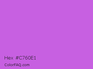 Hex #c760e1 Color is a light purple color and the nearest color is Medium Orchid #ba55d3. Hex code #c760e1 and RGB value is rgb(199,96,225). In RGB color space, this color is composed of 78% red, 38% green, 88% blue, In CMYK color space, this color is composed of 12% cyan, 57% magenta, 0% yellow , 12% black , In HSL color space, this color has a hue angle of 288° , 68% saturation and 63% lightness.