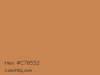 Hex #c78552 Color is a normal orange color and the nearest color is Deer #ba8759. Hex code #c78552 and RGB value is rgb(199,133,82). In RGB color space, this color is composed of 78% red, 52% green, 32% blue, In CMYK color space, this color is composed of 0% cyan, 33% magenta, 59% yellow , 22% black , In HSL color space, this color has a hue angle of 26° , 51% saturation and 55% lightness.