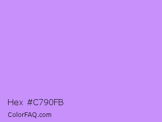 Hex #c790fb Color is a light purple color and the nearest color is Pale Violet #cc99ff. Hex code #c790fb and RGB value is rgb(199,144,251). In RGB color space, this color is composed of 78% red, 56% green, 98% blue, In CMYK color space, this color is composed of 21% cyan, 43% magenta, 0% yellow , 2% black , In HSL color space, this color has a hue angle of 271° , 93% saturation and 77% lightness.