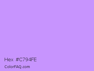 Hex #c794fe Color is a light violet color and the nearest color is Pale Violet #cc99ff. Hex code #c794fe and RGB value is rgb(199,148,254). In RGB color space, this color is composed of 78% red, 58% green, 100% blue, In CMYK color space, this color is composed of 22% cyan, 42% magenta, 0% yellow , 0% black , In HSL color space, this color has a hue angle of 269° , 98% saturation and 79% lightness.