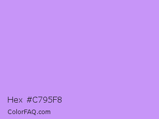 Hex #c795f8 Color is a light violet color and the nearest color is Pale Violet #cc99ff. Hex code #c795f8 and RGB value is rgb(199,149,248). In RGB color space, this color is composed of 78% red, 58% green, 97% blue, In CMYK color space, this color is composed of 20% cyan, 40% magenta, 0% yellow , 3% black , In HSL color space, this color has a hue angle of 270° , 88% saturation and 78% lightness.
