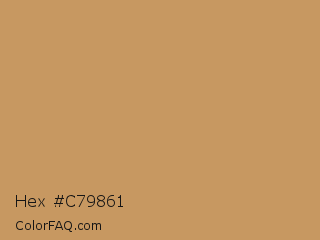 Hex #c79861 Color is a normal orange color and the nearest color is Twine #c2955d. Hex code #c79861 and RGB value is rgb(199,152,97). In RGB color space, this color is composed of 78% red, 60% green, 38% blue, In CMYK color space, this color is composed of 0% cyan, 24% magenta, 51% yellow , 22% black , In HSL color space, this color has a hue angle of 32° , 48% saturation and 58% lightness.