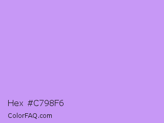 Hex #c798f6 Color is a light violet color and the nearest color is Pale Violet #cc99ff. Hex code #c798f6 and RGB value is rgb(199,152,246). In RGB color space, this color is composed of 78% red, 60% green, 96% blue, In CMYK color space, this color is composed of 19% cyan, 38% magenta, 0% yellow , 4% black , In HSL color space, this color has a hue angle of 270° , 84% saturation and 78% lightness.