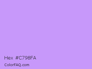 Hex #c798fa Color is a light violet color and the nearest color is Pale Violet #cc99ff. Hex code #c798fa and RGB value is rgb(199,152,250). In RGB color space, this color is composed of 78% red, 60% green, 98% blue, In CMYK color space, this color is composed of 20% cyan, 39% magenta, 0% yellow , 2% black , In HSL color space, this color has a hue angle of 269° , 91% saturation and 79% lightness.