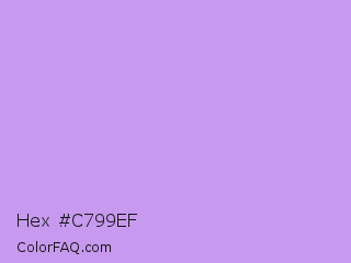 Hex #c799ef Color is a light purple color and the nearest color is Bright Ube #d19fe8. Hex code #c799ef and RGB value is rgb(199,153,239). In RGB color space, this color is composed of 78% red, 60% green, 94% blue, In CMYK color space, this color is composed of 17% cyan, 36% magenta, 0% yellow , 6% black , In HSL color space, this color has a hue angle of 272° , 73% saturation and 77% lightness.