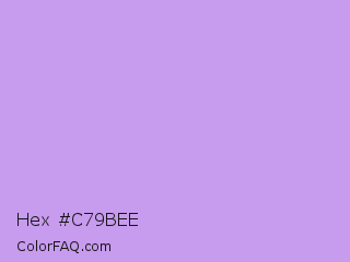 Hex #c79bee Color is a light purple color and the nearest color is Bright Ube #d19fe8. Hex code #c79bee and RGB value is rgb(199,155,238). In RGB color space, this color is composed of 78% red, 61% green, 93% blue, In CMYK color space, this color is composed of 16% cyan, 35% magenta, 0% yellow , 7% black , In HSL color space, this color has a hue angle of 272° , 71% saturation and 77% lightness.