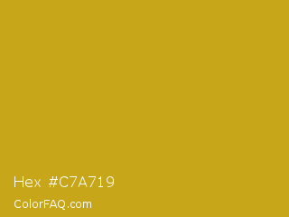 Hex #c7a719 Color is a normal yellow color and the nearest color is Lemon Curry #cca01d. Hex code #c7a719 and RGB value is rgb(199,167,25). In RGB color space, this color is composed of 78% red, 65% green, 10% blue, In CMYK color space, this color is composed of 0% cyan, 16% magenta, 87% yellow , 22% black , In HSL color space, this color has a hue angle of 49° , 78% saturation and 44% lightness.