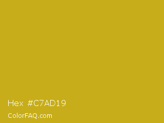 Hex #c7ad19 Color is a normal yellow color and the nearest color is Lemon Curry #cca01d. Hex code #c7ad19 and RGB value is rgb(199,173,25). In RGB color space, this color is composed of 78% red, 68% green, 10% blue, In CMYK color space, this color is composed of 0% cyan, 13% magenta, 87% yellow , 22% black , In HSL color space, this color has a hue angle of 51° , 78% saturation and 44% lightness.