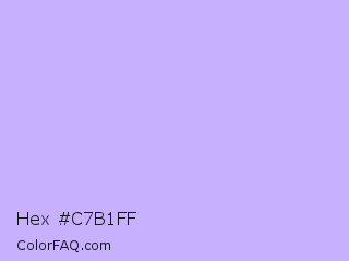 Hex #c7b1ff Color is a very light indigo color and the nearest color is Melrose #c7c1ff. Hex code #c7b1ff and RGB value is rgb(199,177,255). In RGB color space, this color is composed of 78% red, 69% green, 100% blue, In CMYK color space, this color is composed of 22% cyan, 31% magenta, 0% yellow , 0% black , In HSL color space, this color has a hue angle of 257° , 100% saturation and 85% lightness.