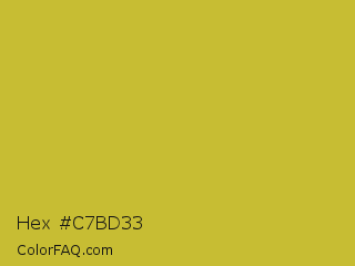 Hex #c7bd33 Color is a normal yellow color and the nearest color is Earls Green #c9b93b. Hex code #c7bd33 and RGB value is rgb(199,189,51). In RGB color space, this color is composed of 78% red, 74% green, 20% blue, In CMYK color space, this color is composed of 0% cyan, 5% magenta, 74% yellow , 22% black , In HSL color space, this color has a hue angle of 56° , 59% saturation and 49% lightness.