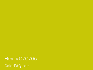 Hex #c7c706 Color is a normal yellow color and the nearest color is Rio Grande #bbd009. Hex code #c7c706 and RGB value is rgb(199,199,6). In RGB color space, this color is composed of 78% red, 78% green, 2% blue, In CMYK color space, this color is composed of 0% cyan, 0% magenta, 97% yellow , 22% black , In HSL color space, this color has a hue angle of 60° , 94% saturation and 40% lightness.