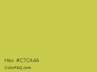 Hex #c7ca4a Color is a normal yellow color and the nearest color is Turmeric #cabb48. Hex code #c7ca4a and RGB value is rgb(199,202,74). In RGB color space, this color is composed of 78% red, 79% green, 29% blue, In CMYK color space, this color is composed of 1% cyan, 0% magenta, 63% yellow , 21% black , In HSL color space, this color has a hue angle of 61° , 55% saturation and 54% lightness.