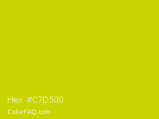 Hex #c7d500 Color is a normal yellow color and the nearest color is Rio Grande #bbd009. Hex code #c7d500 and RGB value is rgb(199,213,0). In RGB color space, this color is composed of 78% red, 84% green, 0% blue, In CMYK color space, this color is composed of 7% cyan, 0% magenta, 100% yellow , 16% black , In HSL color space, this color has a hue angle of 64° , 100% saturation and 42% lightness.
