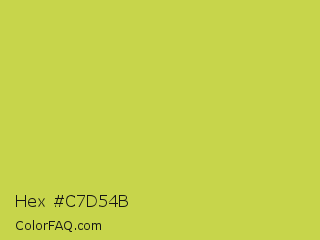 Hex #c7d54b Color is a normal yellow color and the nearest color is June Bud #bdda57. Hex code #c7d54b and RGB value is rgb(199,213,75). In RGB color space, this color is composed of 78% red, 84% green, 29% blue, In CMYK color space, this color is composed of 7% cyan, 0% magenta, 65% yellow , 16% black , In HSL color space, this color has a hue angle of 66° , 62% saturation and 56% lightness.