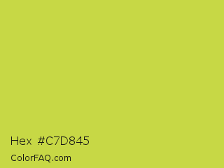 Hex #c7d845 Color is a normal yellow color and the nearest color is June Bud #bdda57. Hex code #c7d845 and RGB value is rgb(199,216,69). In RGB color space, this color is composed of 78% red, 85% green, 27% blue, In CMYK color space, this color is composed of 8% cyan, 0% magenta, 68% yellow , 15% black , In HSL color space, this color has a hue angle of 67° , 65% saturation and 56% lightness.