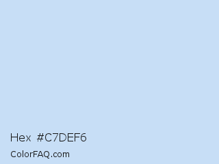 Hex #c7def6 Color is a very light blue color and the nearest color is Tropical Blue #c3ddf9. Hex code #c7def6 and RGB value is rgb(199,222,246). In RGB color space, this color is composed of 78% red, 87% green, 96% blue, In CMYK color space, this color is composed of 19% cyan, 10% magenta, 0% yellow , 4% black , In HSL color space, this color has a hue angle of 211° , 72% saturation and 87% lightness.