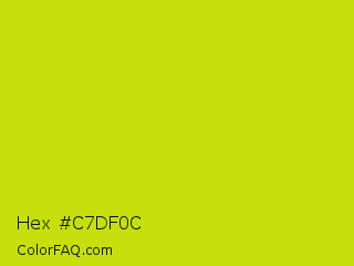 Hex #c7df0c Color is a normal yellow color and the nearest color is Bitter Lemon #cae00d. Hex code #c7df0c and RGB value is rgb(199,223,12). In RGB color space, this color is composed of 78% red, 87% green, 5% blue, In CMYK color space, this color is composed of 11% cyan, 0% magenta, 95% yellow , 13% black , In HSL color space, this color has a hue angle of 67° , 90% saturation and 46% lightness.